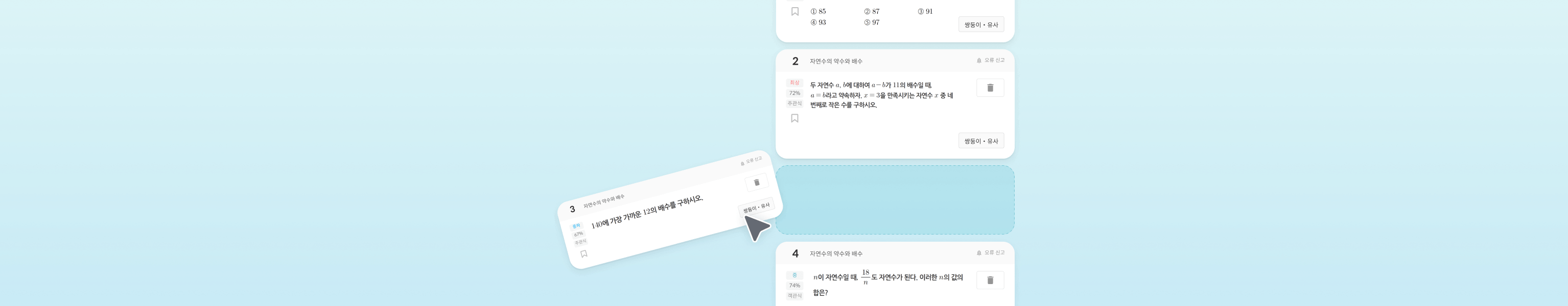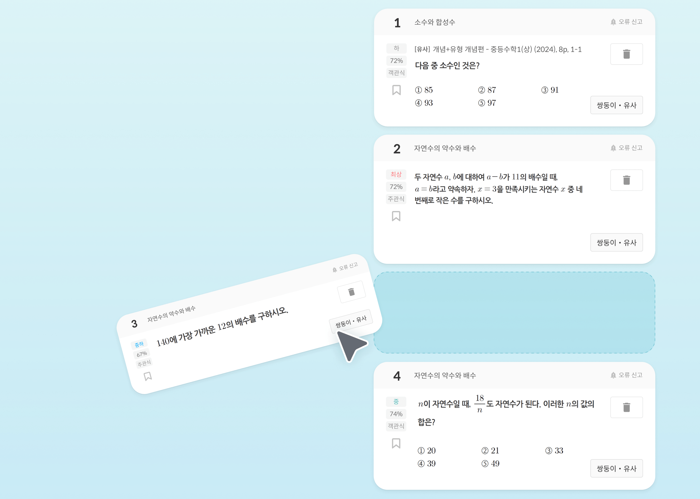 추천된 문제 중 선생님이 원하는 문제를 쉽고 빠르게 선별할 수 있습니다.