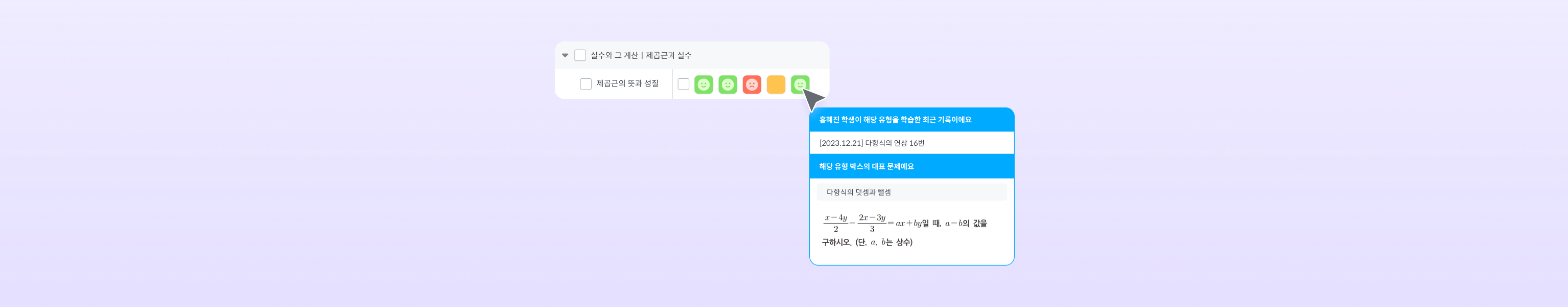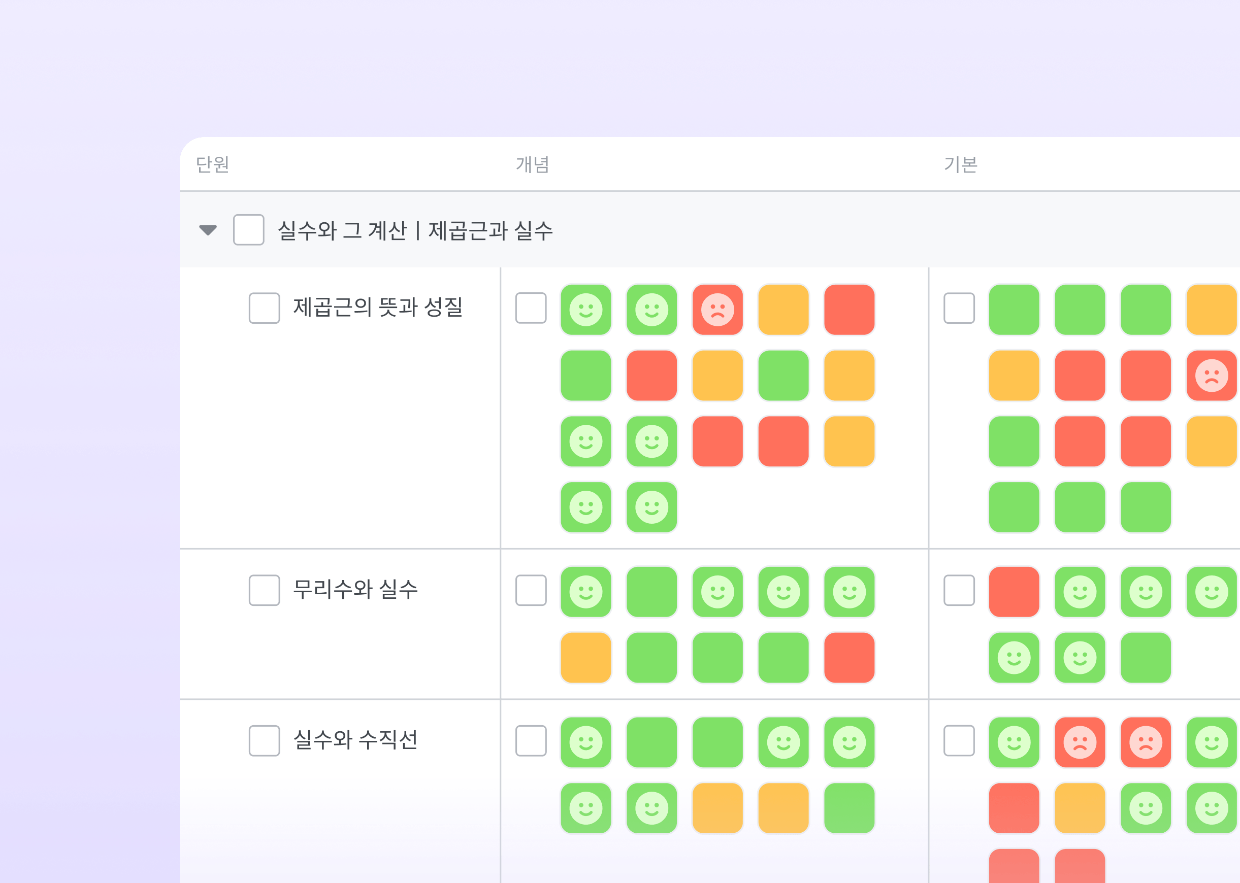 학생의 유형별 성취도를 컬러별로 한 눈에 파악할 수 있습니다. 취약한 빨간색의 컬러를 잘하는 초록색의 컬러로 바꾸어 보세요.