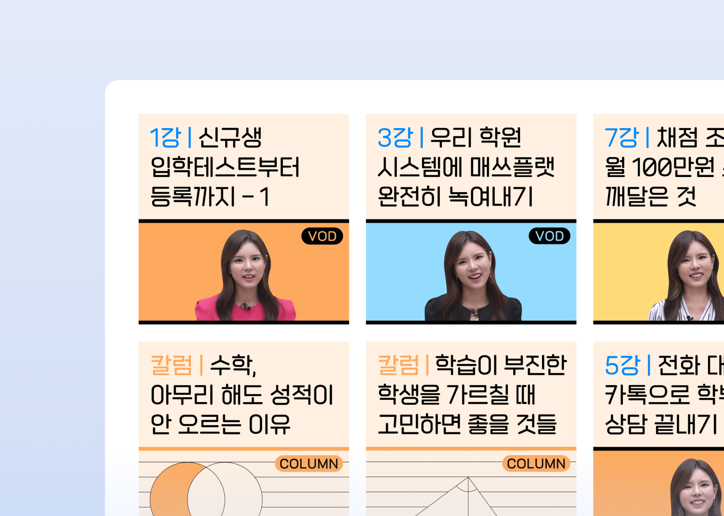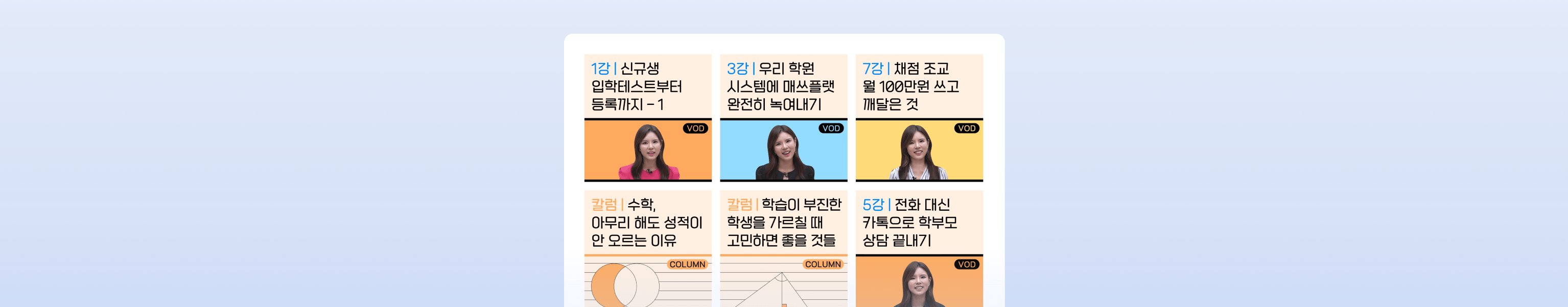 선생님이 원하는 교육방법, 관리, 운영 등의 노하우들을 VOD·칼럼으로 보실 수 있습니다.