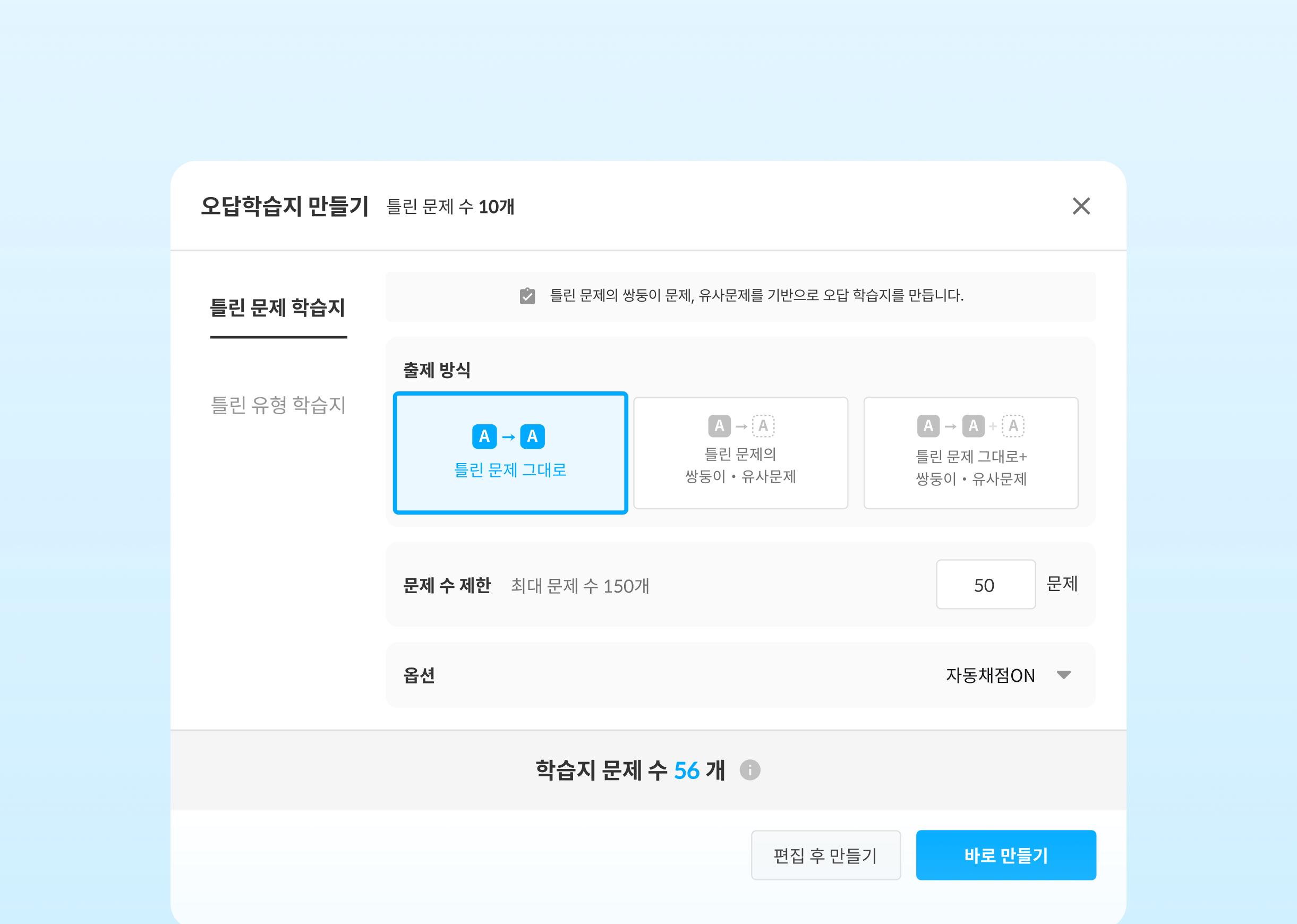 점수가 낮은 특정 학습지들만 선택하여 오답노트를 제작할 수 있습니다.