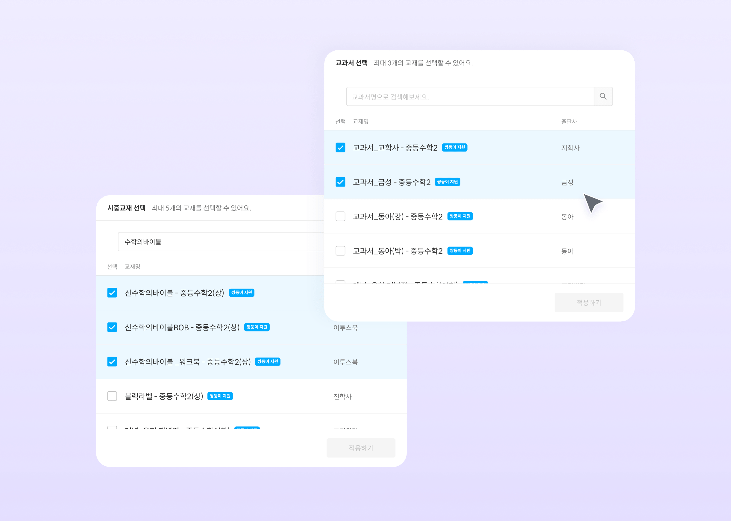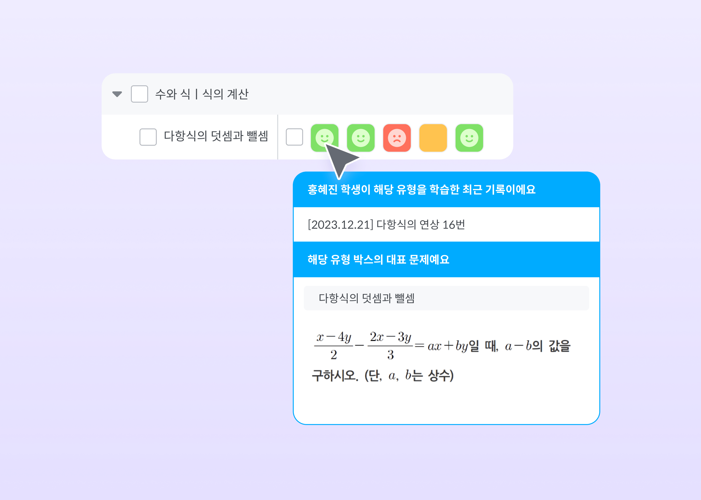 현재 수업 중인 교재를 선택하면 해당 교재의 유형만 뽑아서 이해도를 확인할 수 있습니다.