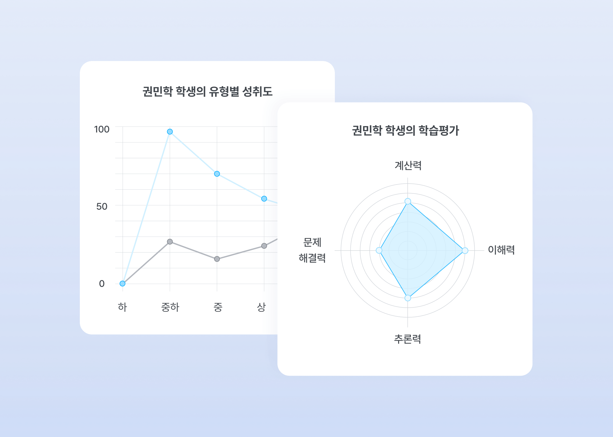 선생님과 학생을 위한 통계 리포트를 제공합니다. 전국, 학년/반 단위 석차와 단원, 유형별 성취도를 확인할 수 있습니다.